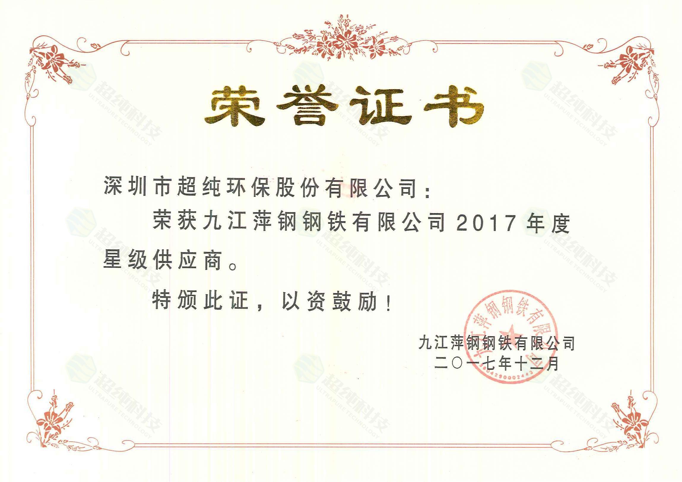 九江萍鋼鋼鐵榮譽證書